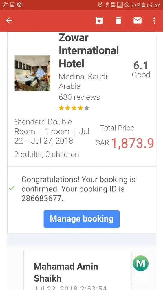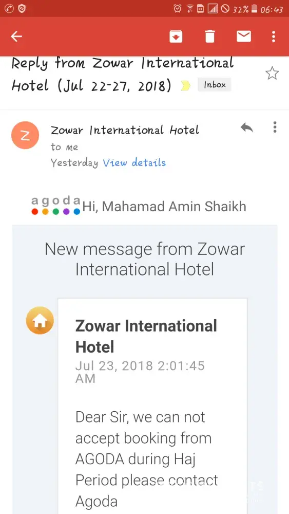 My Booking ID: [protected], I booked 5 nights in MADINA through Agoda app and paid approx 1900 SAR for 5 days stay but when I came to the hotel zowar international in the night 10pm the hotel said we don't have any bookings and we can't provide room talk to Agoda. I tried calling Agoda but no response through phone. I'm here with 3 kids including infant, I plead them to help me out even I have paid money to Agoda. Even after paying money I have to please people and my vacation is spoiled. No solution yet n I'm stuck in the middle. Pl. Help ASAP. I want solution to my problem as my family also suffering. I'm as good as on road even after paying Agoda. My number +[protected] email: [protected]@gmail.com please help. I have attached the hotel response after reaching hotel and the confirmation from agoda.com a day before.