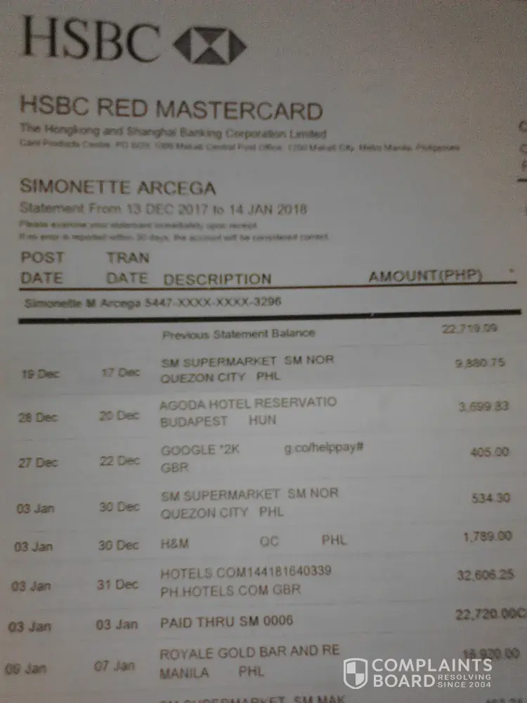 my HSBC red mastercard dec.13-jan.14 2018 billing statement showed a P3, 699.83 hotel reservation last dec. 20, 2017 in budapest, hungary which I never made in a country I have never & don't plan to visit. I checked my booking history and there is no record of such transaction on that date or any other dates & in that country or any country outside the philippines.