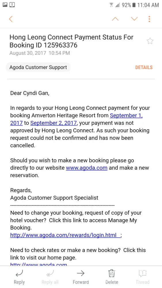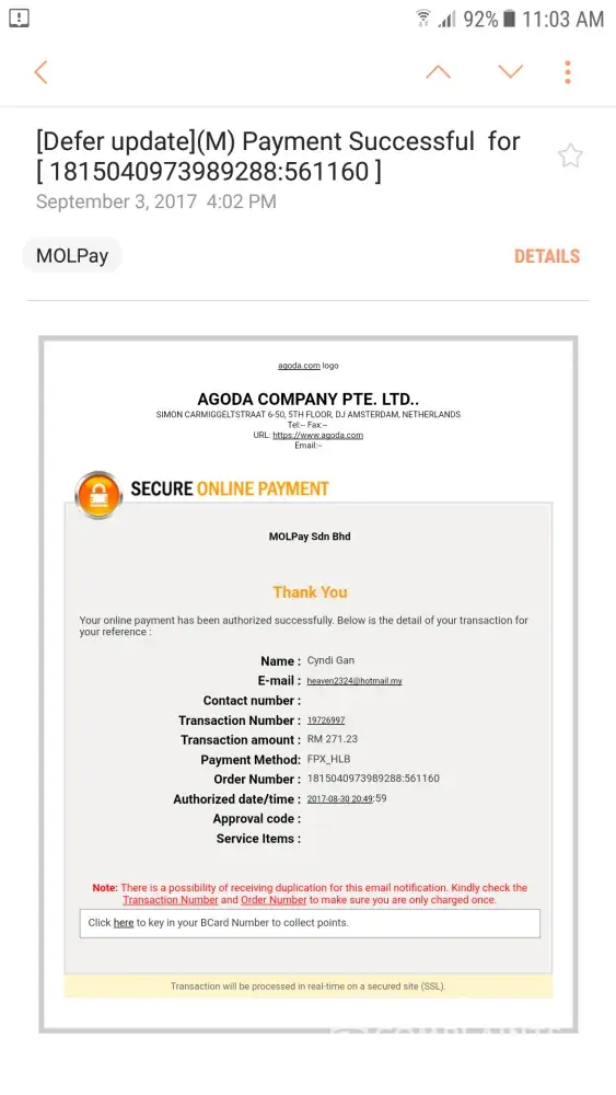 I hope I can hear from you soon. Below I will attach some email screenshot that I received from Agoda and MOLpay. Thanks