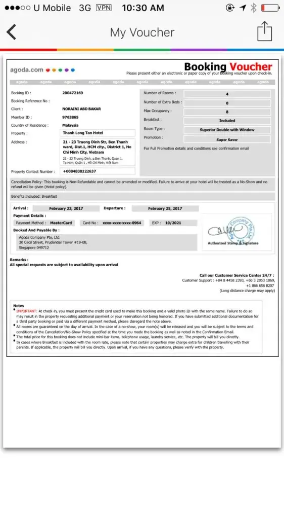 We left on 18 February at 7.30am happily through a long journey and went to check in. To our utter shock, we were told that our booking were cancelled. Naturally, we freak out! We did not understand why it was cancelled and at the same time, the resort has a bad Wi-Fi connection which makes it even harder to check on our status. After a long time, we were managed to get the connection and went back to the email and status in Agoda account and found out it was cancelled and an email was sent only at 9.36am on the same day at 18 February 2017. This blew our mind.. Without proper notification and Agoda decided to just cancelled our bookings 5 hours before our check in time. The worst thing it, for some reason our bookings was transferred to BOOKING.COM (God knows why) and thats why the resort couldn't trace it for a while...
