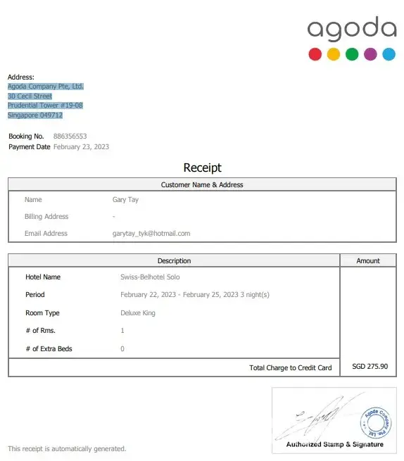 When I asked for recipt at the hotels upon checked out, they would not provide me a receipt and mentioned that Agoda would issue the receipt.