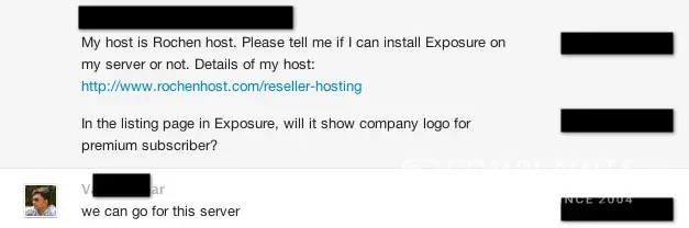 The reason I decided to purchase Exposure script was because I received a confirmation from your online support and yes, I use shared host. I asked the guy during a Skype conversation that "My host is Rochen host. Please tell me if I can install Exposure on my server or not. Details of my host: http://www.rochenhost.com/reseller-hosting". He gave me back confirmation "We can go for this server". See the attached picture for yourself.