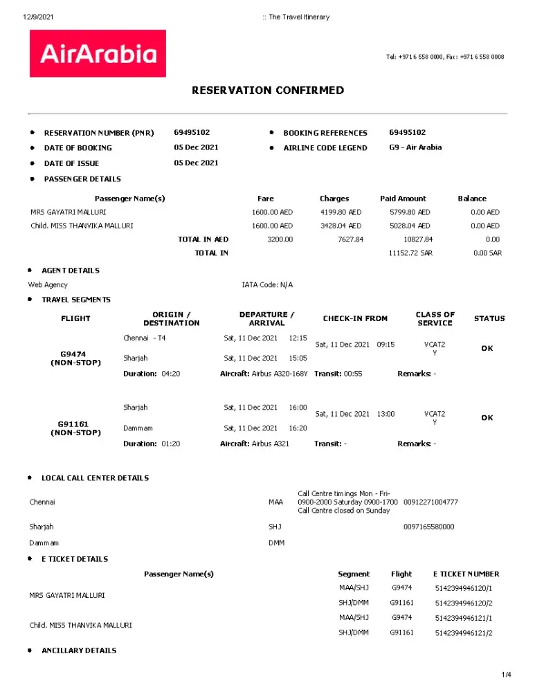 My family is traveling from Dammam to Delhi via Sharjah dated Dec 03 2021.