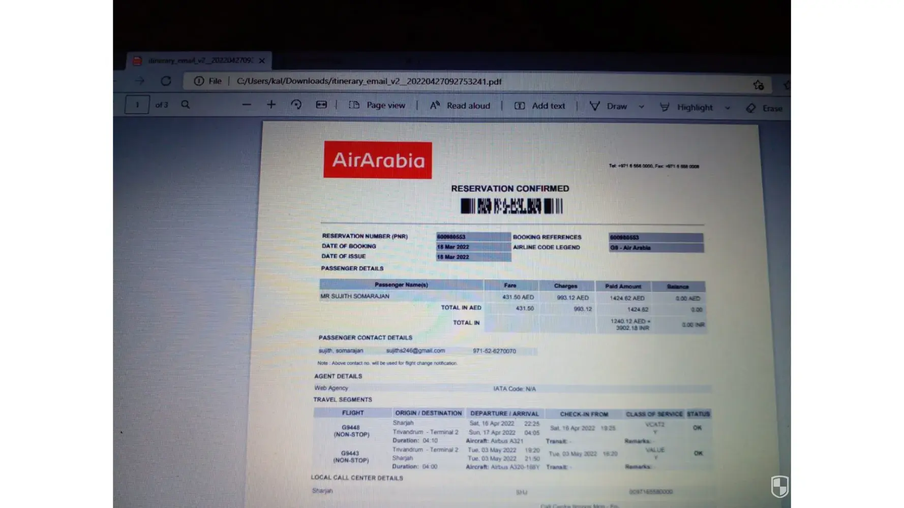 i have booked a ticket with pnr no [protected] from thiruvananthapuram to Sharjah.