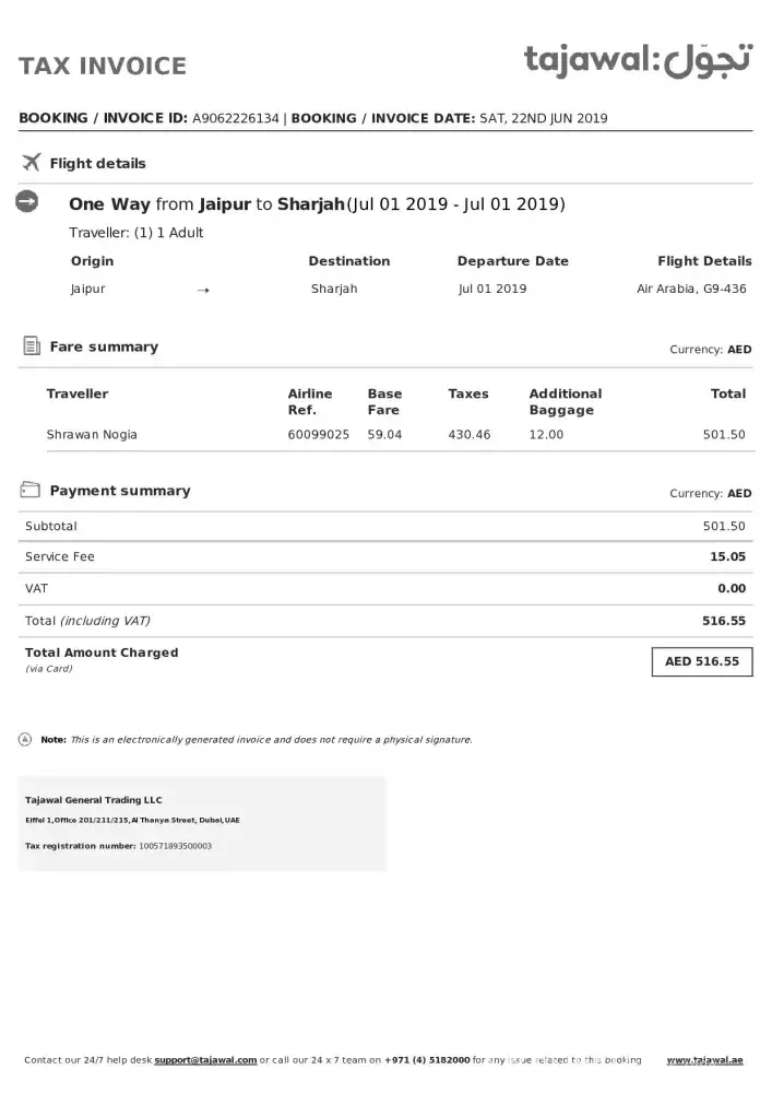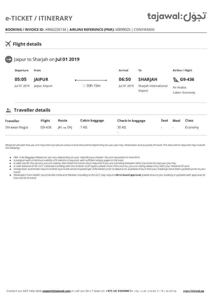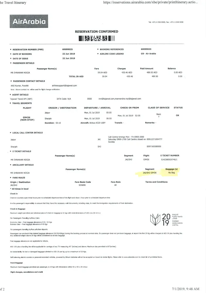 I have travelled from coimbatore to Muscat via sharjah on 29.6.19 by G9414/ G9112.