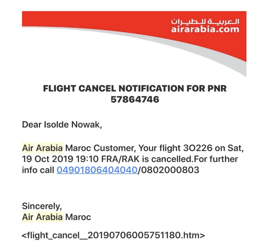 We booked and paid 4 tickets from Frankfurt to Marrakech and back for October - November 2019. The airline cancelled the flights beginning of July 2019. Up to now we did not get our tickets refunded. Air Arabia does not respond emails, provides customers only with costly phone numbers and when we try to call they stop the call as soon as they hear what we want.
