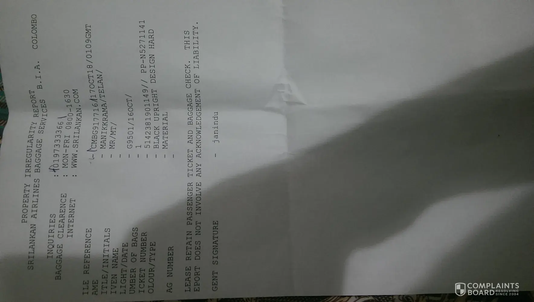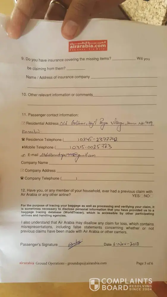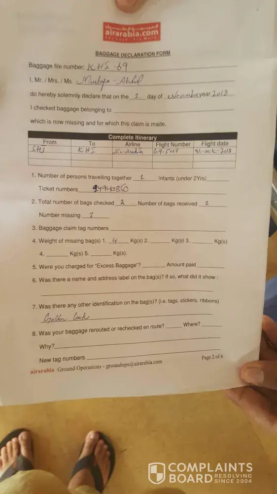 I took air Arabia G9 501 on 16 oct 22.20 hrs from sharjah UAE to colombo Sri Lanka. But my baggage was not there when I landed in Sri Lanka. As per baggage service in katunayake international airport the tag they have put on my bag is wrong and what they gave me as well. Anyway I had two baggages one small and one big I got only small bag. After passing almost a week they don't take any action for their mistake and I don't have my things what are in my lost baggage.please kindly put attention on this matter.