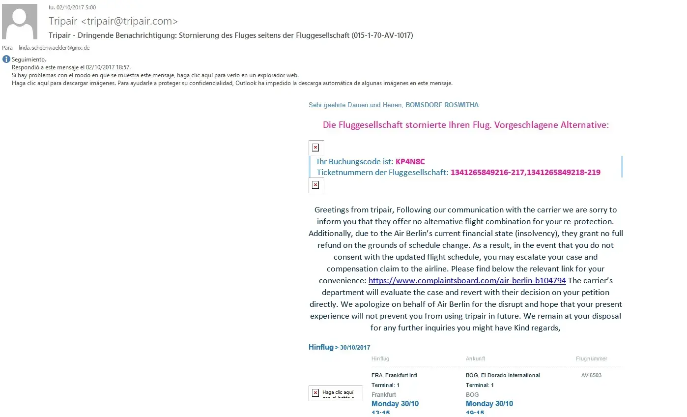 The flight from Air Berlin from Berlin to Frankfurt with the flight number AB6577 for October the 30th at 9:30am was canceled. The booking number for the flight is 4835EN. Unfortunately there won´t be any other flight provided to Frankfurt were we need to go because our destination is Bucaramanga (Colombia). Since we paid the flight and need to go to Frankfurt we expect to get a refund for this canceled flight. Because we have to search for another alternative to get to Frankfort on October the 30th which will cost money and time.