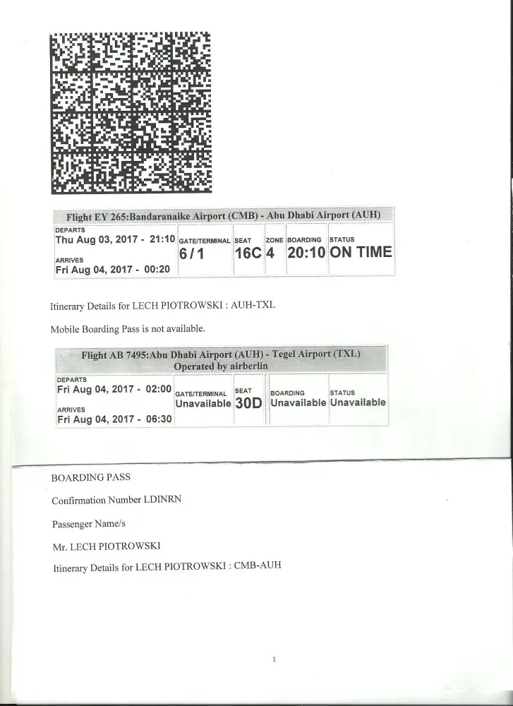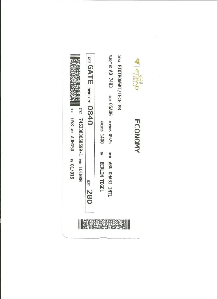 My name is Lech Piotrowski and my flight AB 7495 from Abu Dhabi to Berlin was cancelled on the day it was meant to happen (04 August 2017 02:00). I was provided with this information just as we came from Colombo to Abu Dhabi. My next flight I was booked for (AB 7493) was on the next day (05 August 2017 09:25).