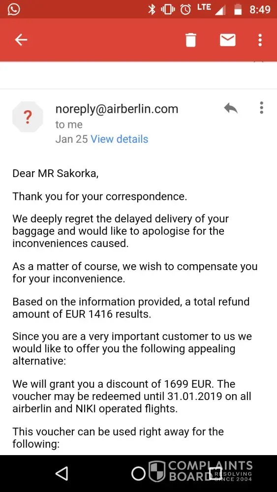 As compensation for the flight delay you will receive a discount of 600 EUR on your next booking with airberlin and NIKI.