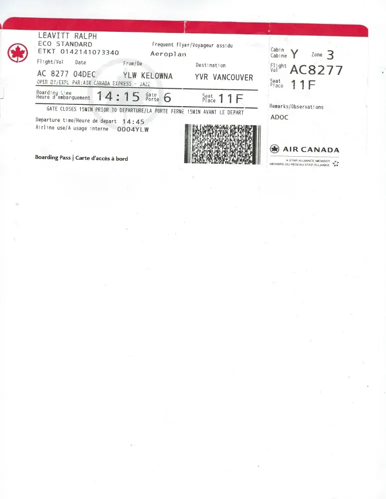 Flight December 4th, Kelowna to Vancouver.