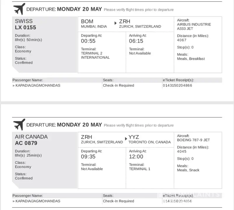 My name is Chandrashakhar Gosine and I am a senior citizen. At 12:27 AM on March 13, 2019 I booked a round trip from Halifax, Nova Scotia to Port-of-Spain, Trinidad, booking reference LAJFWE for departure on March 19, 2019 returning on March 31, 2019. This was a Business Class I on Aeroplan Rewards, 60, 000 plus $305.05 CAD. My ticket number was [protected]