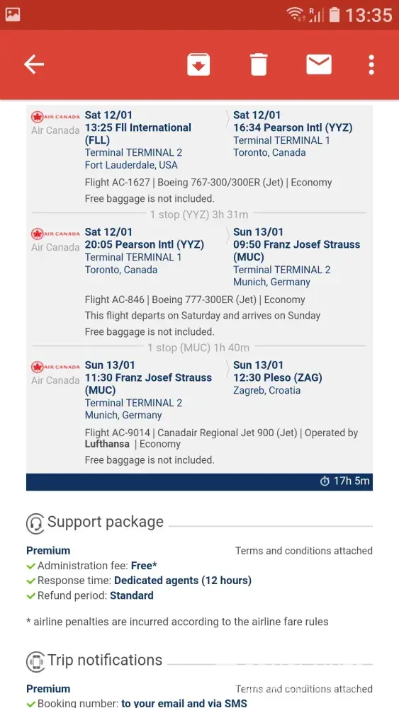 On 12th of January my flight number ACa 1627 from FLL to Toronto Pearson was delayed for more then 5 hours due to the tehnical problem, that afected my next flight to Munich and next flight to Zagreb, so I had to stay overnight in Toronto even tho I had emergency issues at home.
