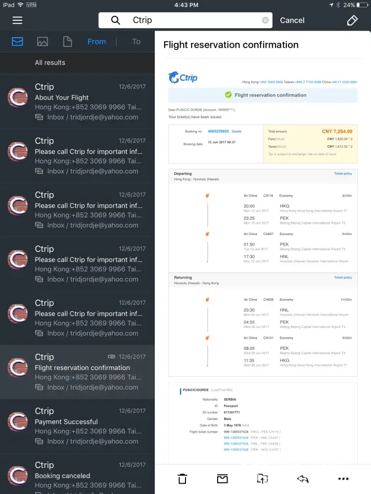 Namely, on June 12, 2017 my husband and I were supposed to be on the flight from HKG to HNL via PEK (flights CA116 and CA837). We had hotel bookings paid for two-week vacation in Hawai'i with interisland flights between three Hawai'i islands, as well as rentacar reservations.