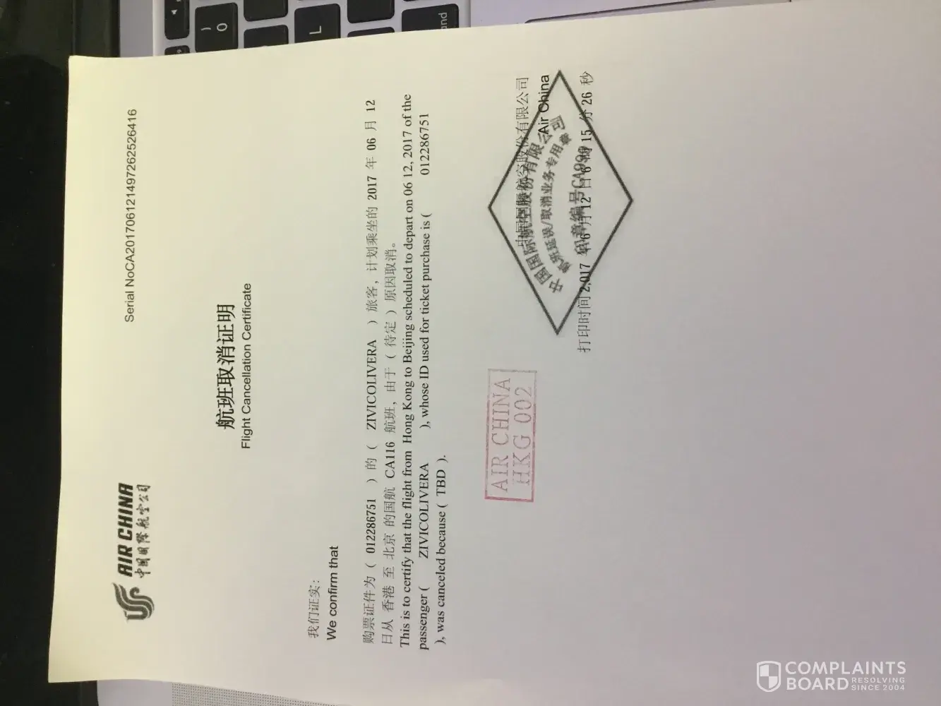 On 21st July 2017, my flight CA 115 from HK to Beijing was cancelled.