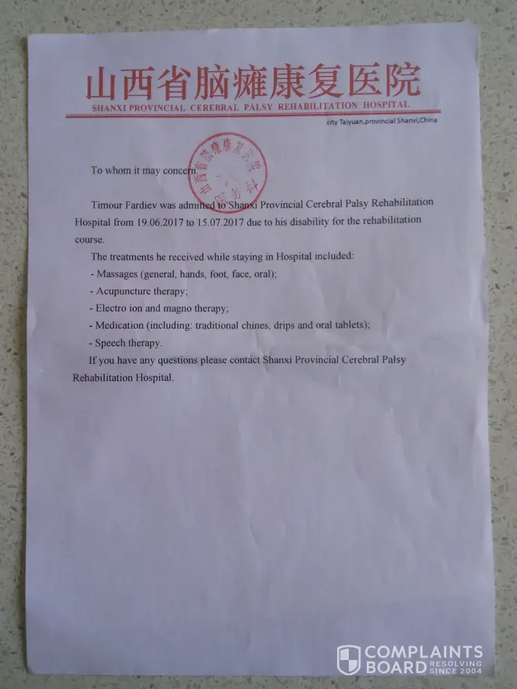 I went on a trip to the Shanxi Provincial Cerebral Palsy Rehabilitation Hospital Taiyuan China, with my disabled 5 year old son on 17.06.2017 (see attached booking). Our luggage had been lost on the way, and we were left without any change clothes and personal items for 3 days until it was finally found. Being extremely busy with my son’s treatments I did not have time to lodge a complaint or compensation claim in this case.
