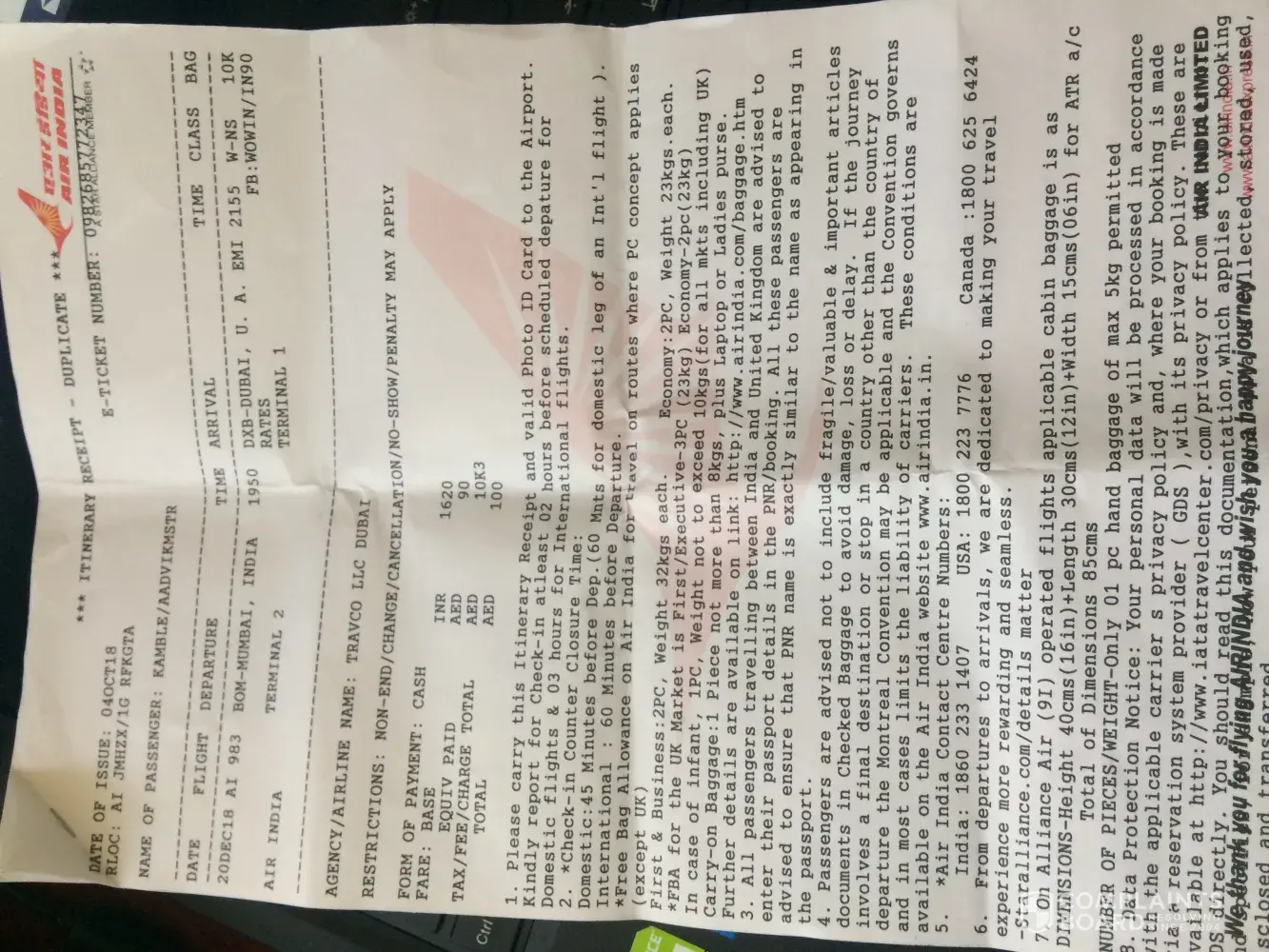 FLIGHT NUMBER-AI 983 BOM -DXB TIME 19:50