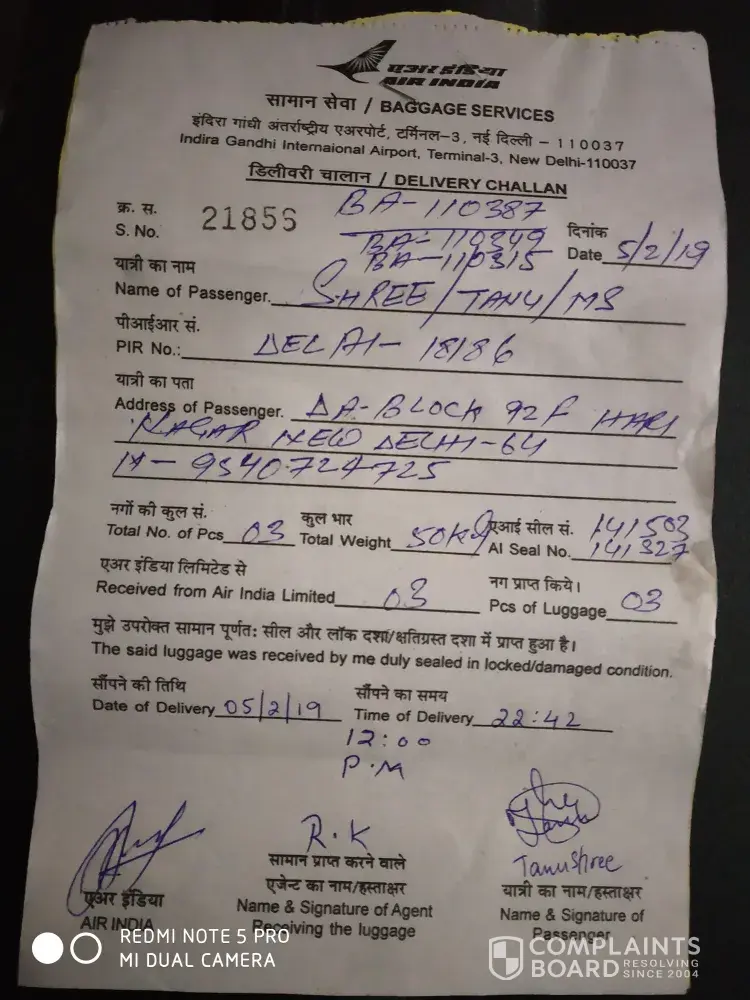 After 3 days of anxiety, I received a call from Air India on 5th of Feb, I was informed by telephone about tracing of baggage and subsequently the baggage was delivered at my temporary address in India only on 5th of Feb at 22:42 PM., Copy enclosed.