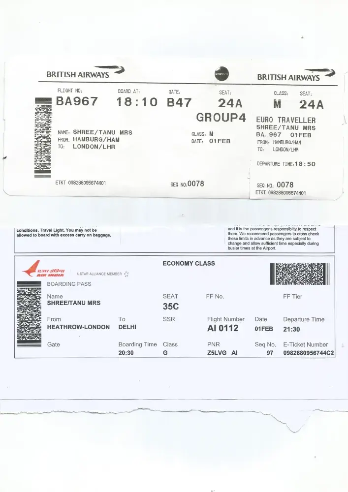 From Hamburg to London/LHR I travelled by British Airways, Flight No. 967 dated 1st Feb.2019 and from London/LHR to Delhi by Air India Flight No AI 0112 dated 1st Feb. 2019. I had booked flight with British Airways from Hamburg to Delhi. (Copies of Boarding Passes enclosed)