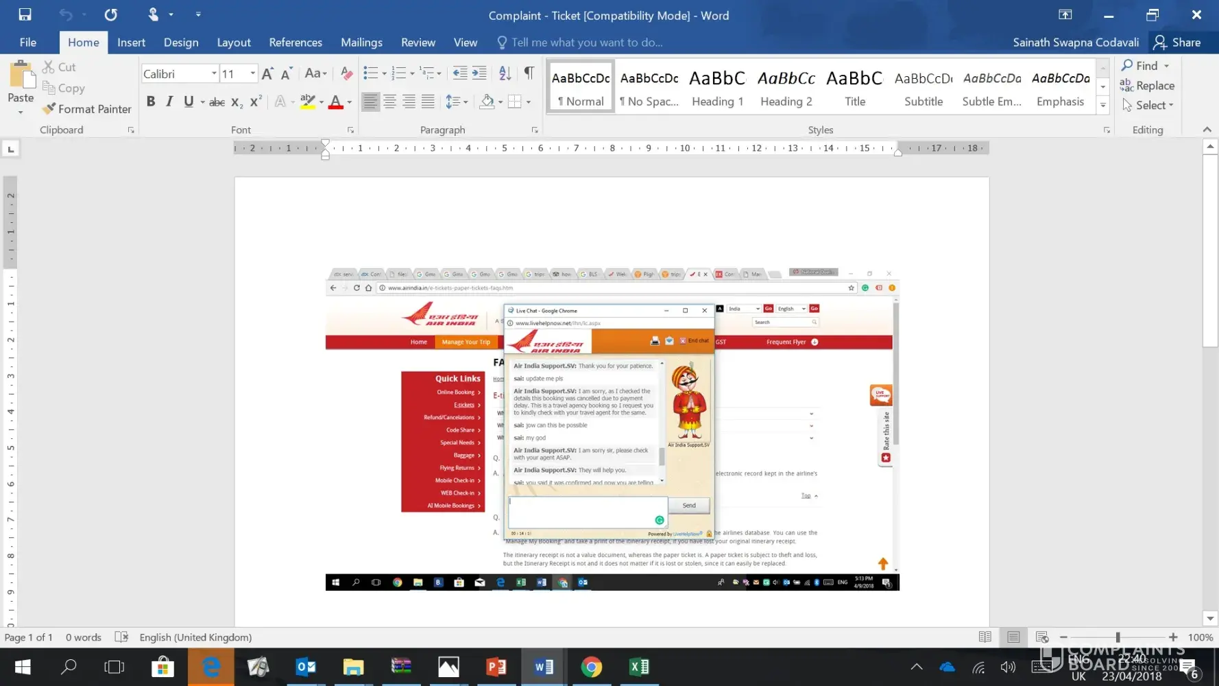 misguidance by customer agent live chat - air india website