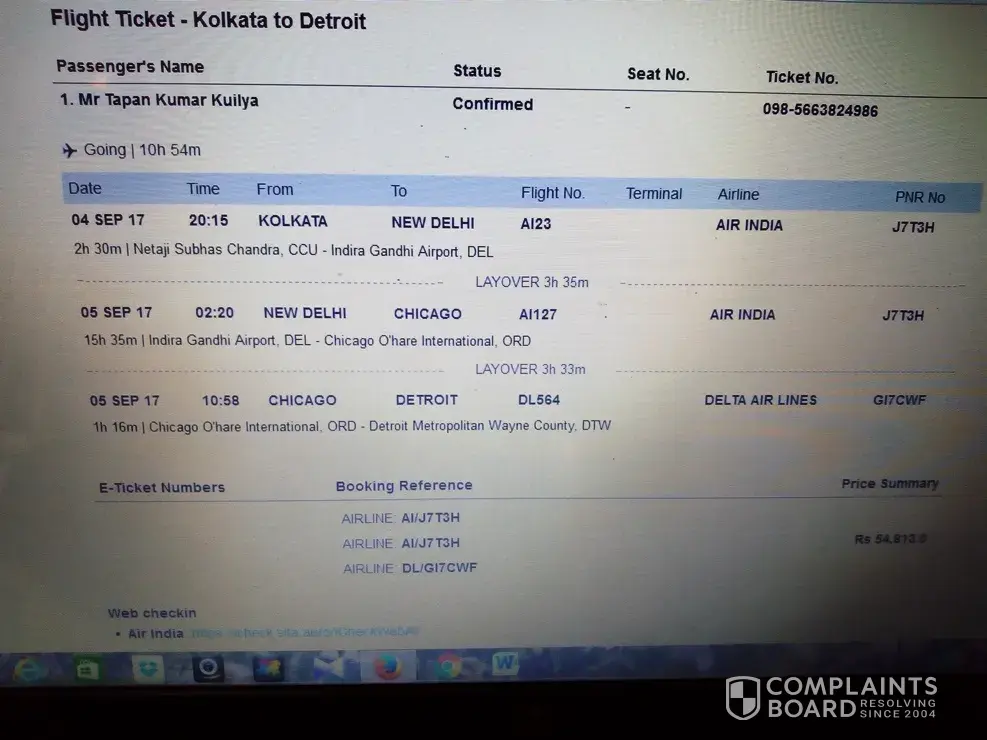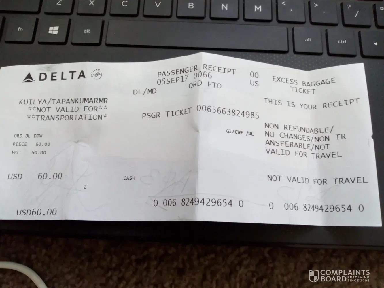 I have booked my flight ticket from CCU to DTW airport at 4 sep 17. When I took boarding pass from Chicago airport by the Delta airlines. They have taken extra money 60 dollar regarding excess baggage. I know that connecting flight don't take excess money from any passenger due to tier up between air india flight and Delta airline. Delta airline is the connecting flight of Air india flight and tier up with them. Why are they took extra money from me? Due to tier up with delta and air india please let me returne my extra money which have taken from chicago airport by delta ticket counter. I have attaching my booking details and tickets details (flight details) with this complaints box.