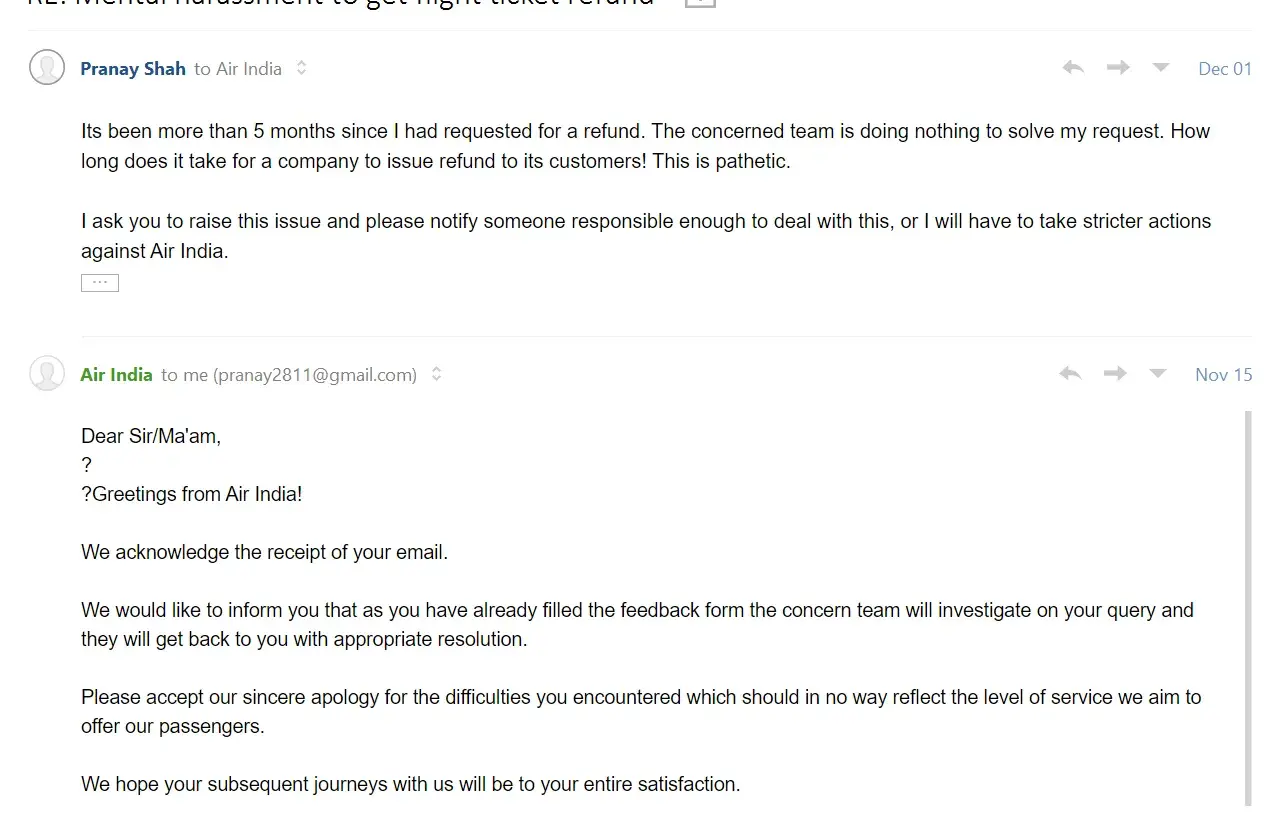 I have sent 3 emails to [protected]@airindia.com and [protected]@airindia.com and no response.