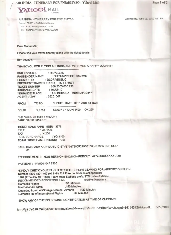 Air india633 Dt:11/11/10, time:9.00pm Air india633 Dt:12/11/10, time:2.00am