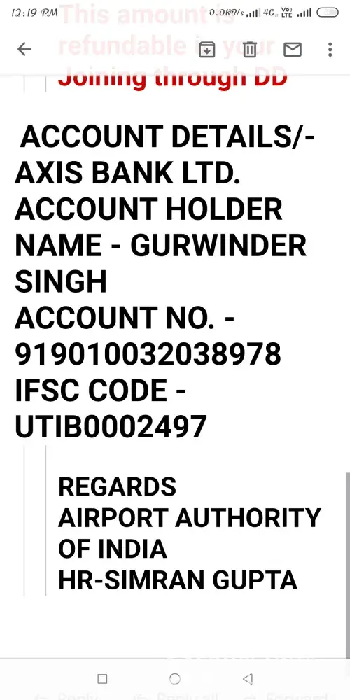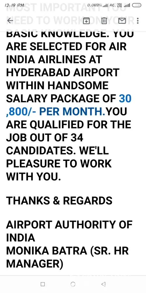 My name is Bhonagiri Anil kumar i had received a message from @jobs updates. names Monika Batra(Senior Hr Manager) mentioning that my job application has been selected in air india for domestic airport, for joining send passport size photo, i'd proof, education certificate and updated resume on Mail id is airportauthrityofindia123zoho.com. When i chatted to this mail he replied me my job post is ticketing excutive at Hyderabad RGI Airport (Shanshabad) and my joining date is October 1st of 2019. There was completed my telephonic interview, i will Got A successfully finished interview. Then air india application @rs.2500 pay till today by online in this ACCOUNT DETAILS/-