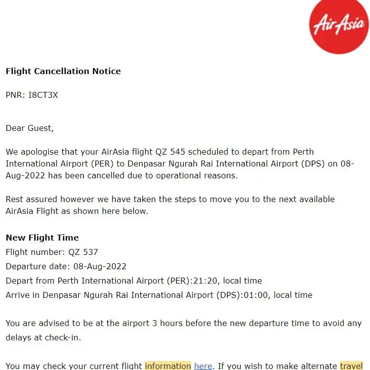 Ref: (AURVPV) Your AirAsia flight FD4104 has been moved to FD4100 on 04-Aug-2022 at 06:45hrs. Please check your email for more info.