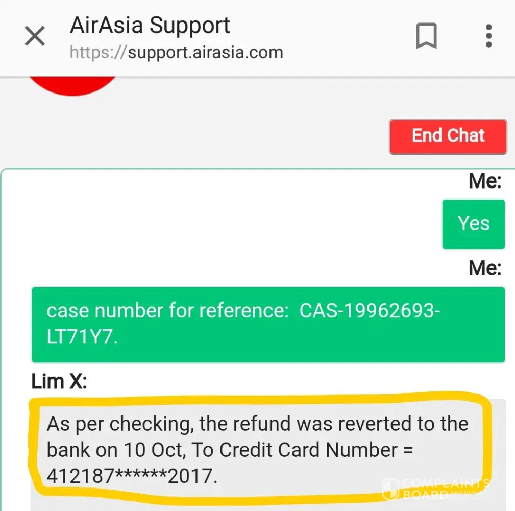 AirAsia canceled my flight and gave me the option to "refund". Now, on my profile, the status of my refund is "Approved. Submitted to bank." On chat online, the AirAsia informed me that the refund was reverted to the bank on Oct 10 (see the attachment). However, my bank has not received the money yet! The bank asked me for an AirAsia voucher for the refund. I requested through the Feedback online but still did not get an answer (case number [protected])! I need Air Asia to comply with the arrangement, as expected from a serious company, and SEND ME THE PROOF OF REFUND PAYMENT, so that I receive the canceled flight's value. I even had to pay for the ticket! I look forward to returning as soon as possible. My Booking number: CHF56C. Yonara