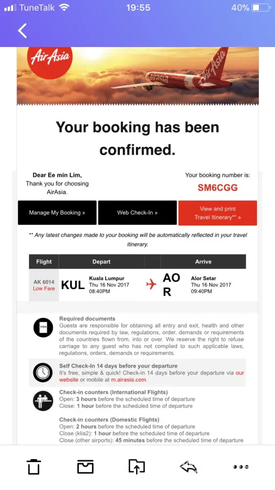 So, I proceed to check in at 7pm at counter S, the staff said my flight is supposed to be 1925 and I can't proceed with checking in, I told her my flight is supposed to be 2040 according to the email but she checked the booking number and said I booked AK6014 and the flight time is on 16/11, 1925, and she asked me to proceed to sales counter to buy new ticket !