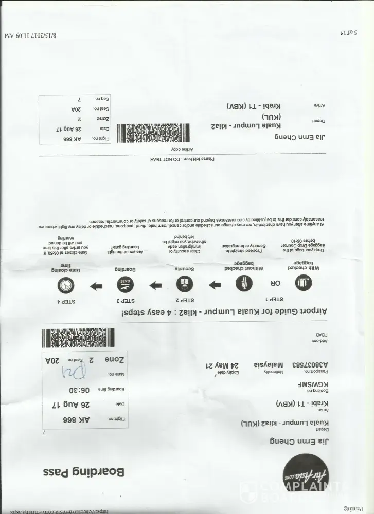 Attached herewith the report I lodged with the Johor Air Asia Officer with the flight ticket.