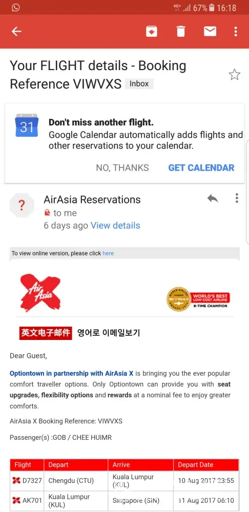 AirAsiaGo travel confirmation - 26 Aug - (Itinerary # [protected])