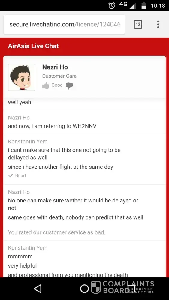 Hence, I have decided to address my concern to airasia customer service, where I have used a phone call which was so hard to get through and finally a life chat. A life chat stuff was very rude and was giving me advice that no one can be sure about their death or when they die. This was very inappropriate to hear from the passenger carrier company.