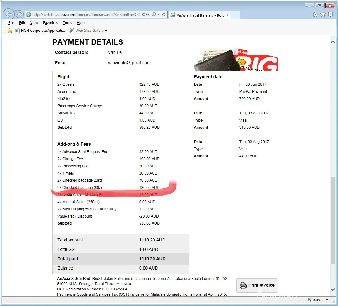 my booking no is MHSTQC. I think AirAsia overcharged me 80.00 AUD for my upgrading luggage 20kgs (previously part of value pack(VP) ) to 30kgs. if my 20kgs VP worth 39 AUD and if I upgrade to 30kgs, I 'd be happy to pay for 29 or 58 AUD in total for the extra 10 kgs for 2 passengers. Instead, AirAsia system charged me x2 passengers 136 AUD( 2x68 ). Please see AirAsia 3rd page tax invoice.