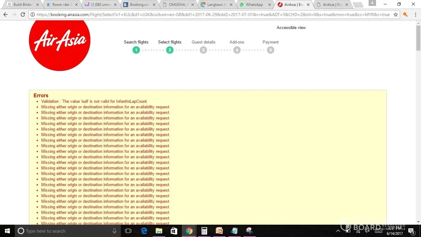 I recently booked flight tickets from Kuala Lumpur International Airport 2 (klia2) to langkawi and the dates were 29 June 2017 to 1st July 2017 and proceed to check out during this process i was keep on having this attached error and i need to keep refreshing the page to proceed with next page.