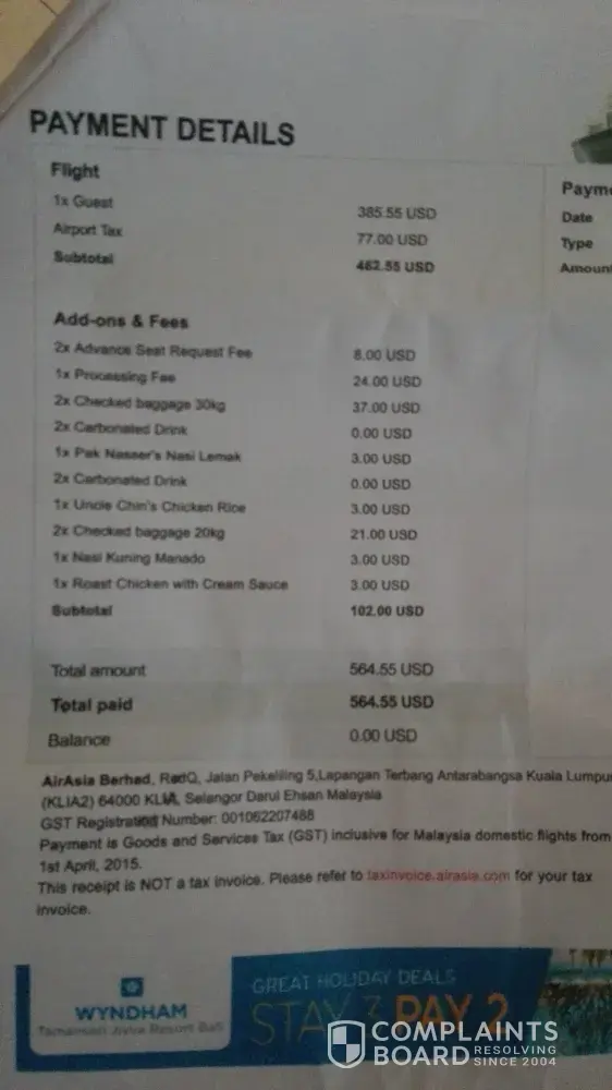 The next reason I was given is that I can't be helped since there is no name on the ticket and therefore airasia can't verify that I made the booking. Showed him the receipt and ticket which was issue to my email address.