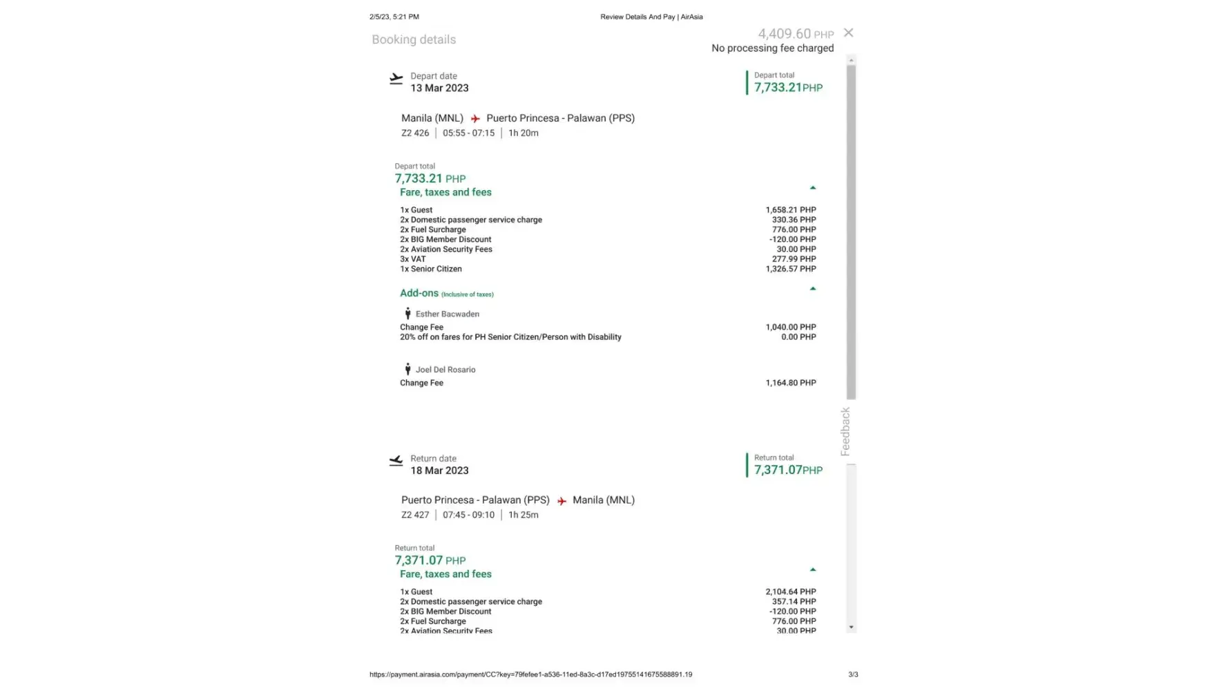 I booked a flight for my Lola going to Puerto Prinsesa worth P 10,694.68 for two people. I tried changing the date to March 13-18 instead of Feb 13-18 and their online site is asking for additional of P 4,409.60 on top of the first payment I already made.