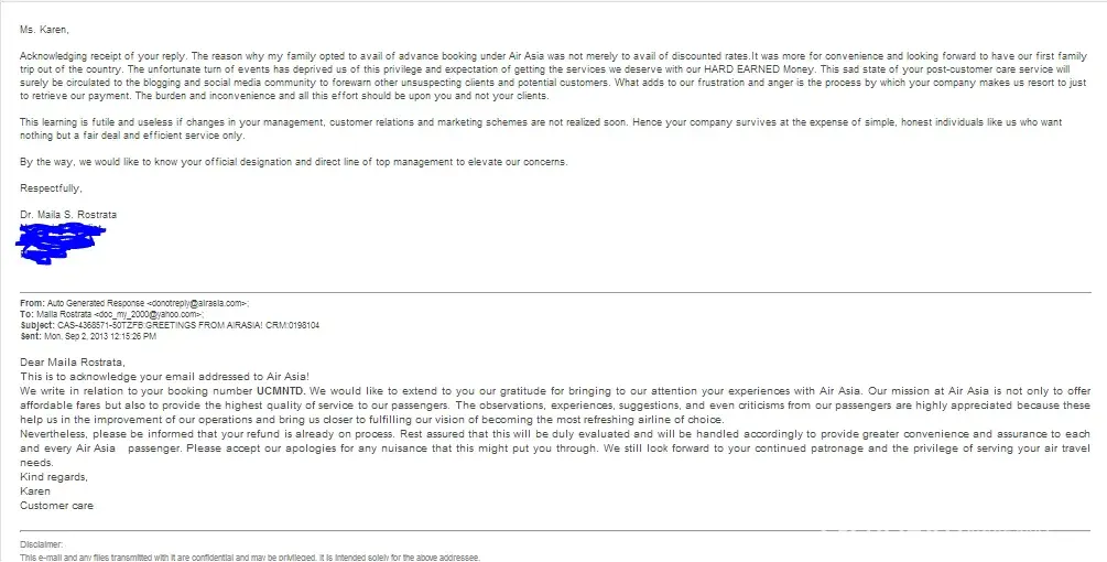 This is the email I sent to AirAsia, however, they are not reading it and keep sending me a rejection email.