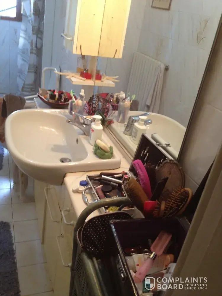 The bathroom is pitted out with the hosts nasty makeup supplies. Stains are dripping along the counters and on the mirrors. Look at the photos!