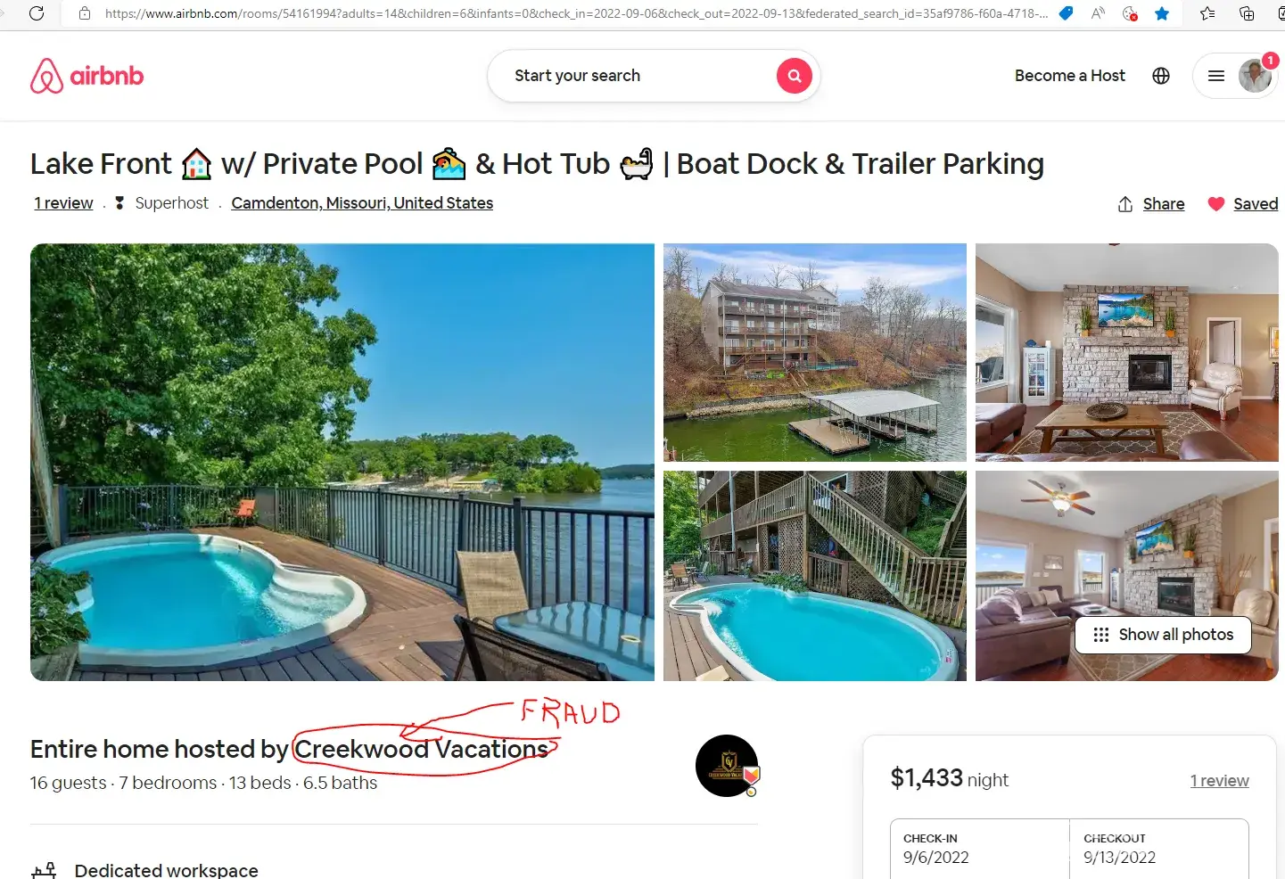 Airbnb Report of fraud. I am the owner of 27 Lilac Loop in Camdenton MO, USA, the host does NOT have my permission to list the property on Air Bnb