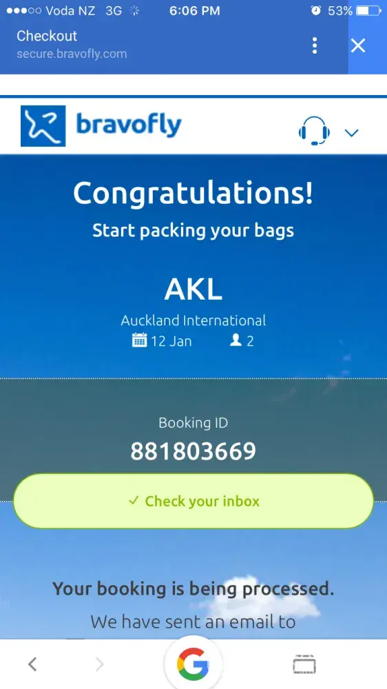 I bought 2 airfare ticket manila - auckland worth $1, 432 NZ dollar, upon succesfully paying my booking. It pop up that visit my email to check my itinerary. An hour after there were no itinerary from bravo fly. So i called their customer service. And to my surprise the customer service asst are angry with me and telling that they havent booked with the air asia. An hour after i called again i called again and telling me that i need to pay another $99 because the airfare increase. So i browse the review of bravi fly and found out that they have poor reviews and most of them are negative.