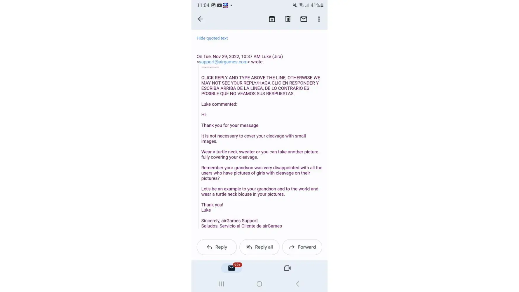 I'm a concerned mom n grand mother who will make so much noise with the FTC and Canadian Government who over sees online Companies I got made fun of n my grandsons feelings because he felt uncomfortable to continue to play a game were profile pictures were basically advertising sex so because I turned those profiles in to help clean up the game and site because it is a kid friendly site the email I got was so disrespecting to me n my minor grandson all kids have a right to feel comfortable playing a online game a site we're it's 14 years and older 14 years of age is still a minor and these emploess are making fun of us check out this email and I will show the profiles I will make so much noise the fact they don't care about kids n it's all about money doesn't give em a free pass to disrespectful