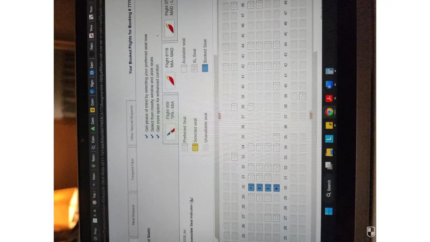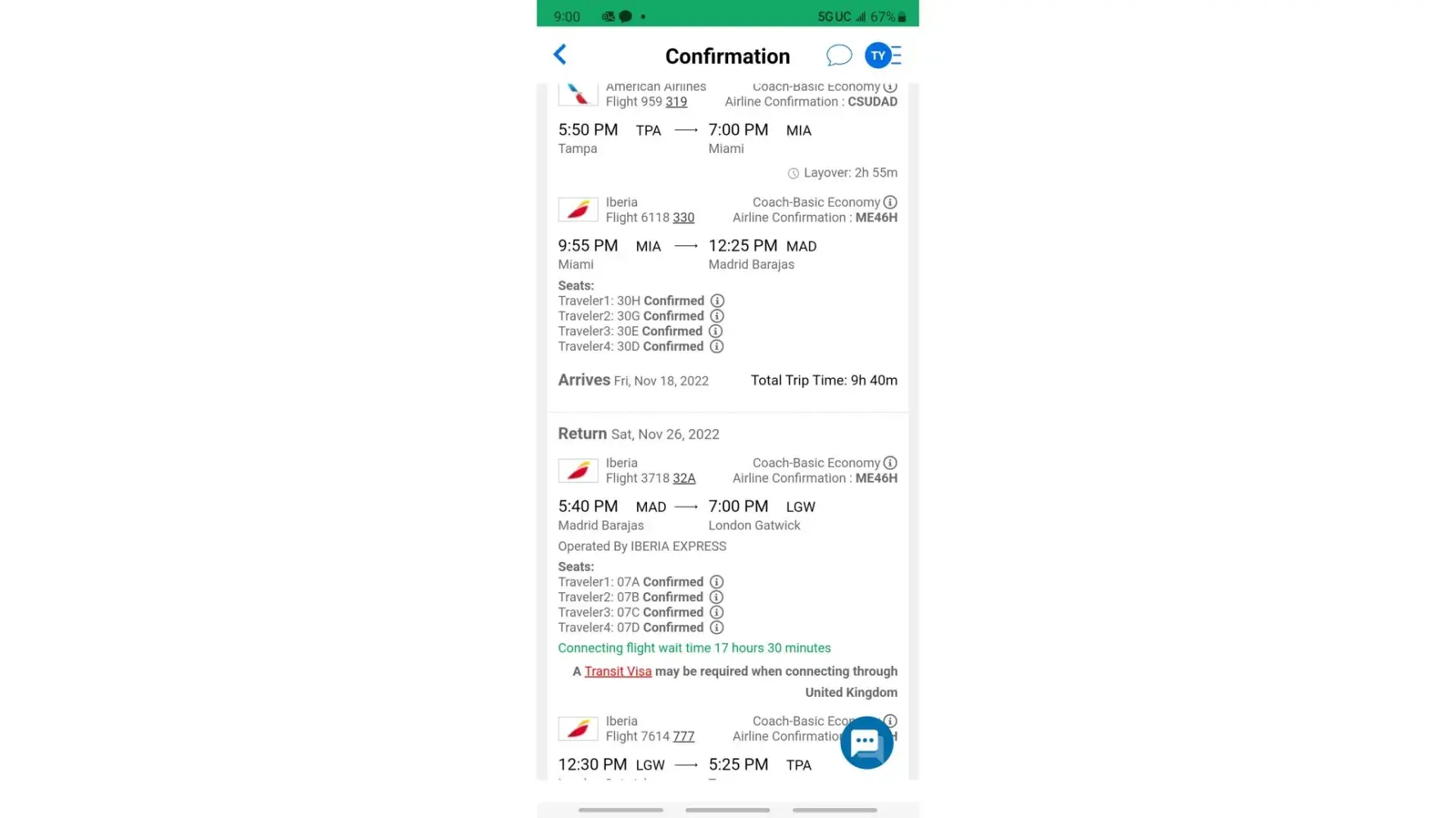 Friday November 18, Flight 6118 confirmation ME46H. I already bought seats for me my wife my 14 year old girl and my 7 year old boy. Try doing check in on Iberia website would not allow me, ask American airline to check us in from Tampa to Madrid, they said they are not allow, they advice to check in when I arrive in Miami. In Miami went to get my boarding...