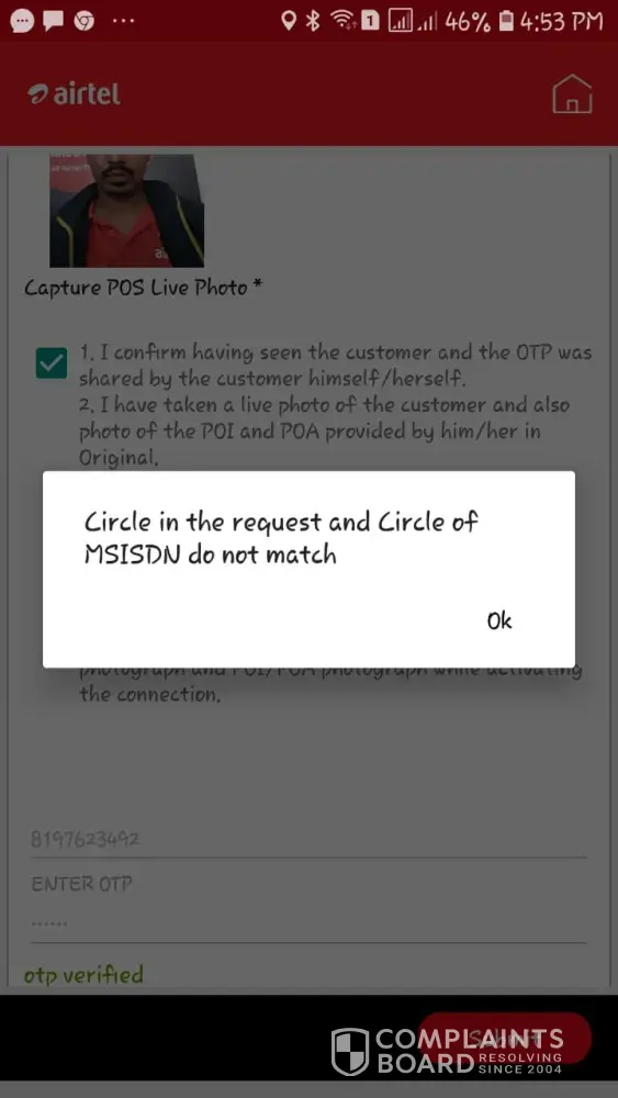 I also tried going to Airtel office and when they tried activating my number it's showing "Not same circle" error(You can see the screenshot attached). This is complete negligence from Airtel.