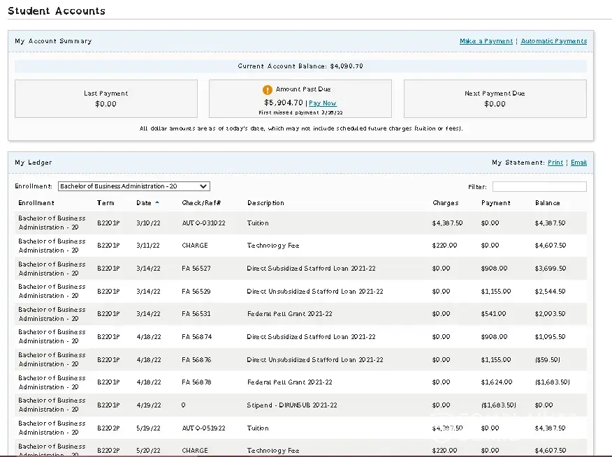 Here are some screenshots. Also if you will notice at the bottom of ledgers something is also askew, because the information doesn't even make sense. Mind you this all occured between the middle of December, and the 13th of January. I wasn't informed that I had any due balance, but then all of a sudden I'm almost a year past due, and getting locked out. I've attempted to address with student accounts to which I haven't recieved a response, I also sent them the pictures. I'm sure they were shocked