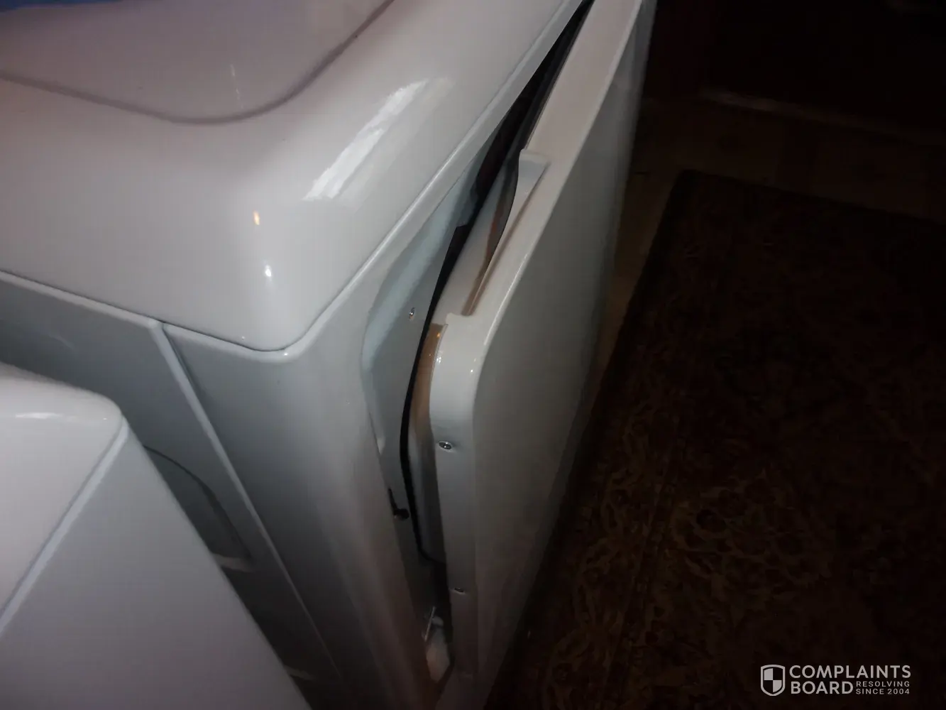 Door was dented upon delivery and will not stay closed. I need another door or repair on this one. I can not use this dryer because the door will not stay closed. It was either damaged enroute or the delivery men did it accidentally. Washer was fine, but the dryer is unusable. I would appreciate it if you would correct this situation.