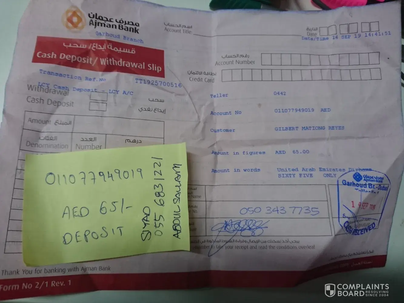 I am writing this complaints to you with regards to my request for a liability letter from your bank in Garhoud which I requested on 14 September 2019 and paid the amount of 65 aed on the same day.