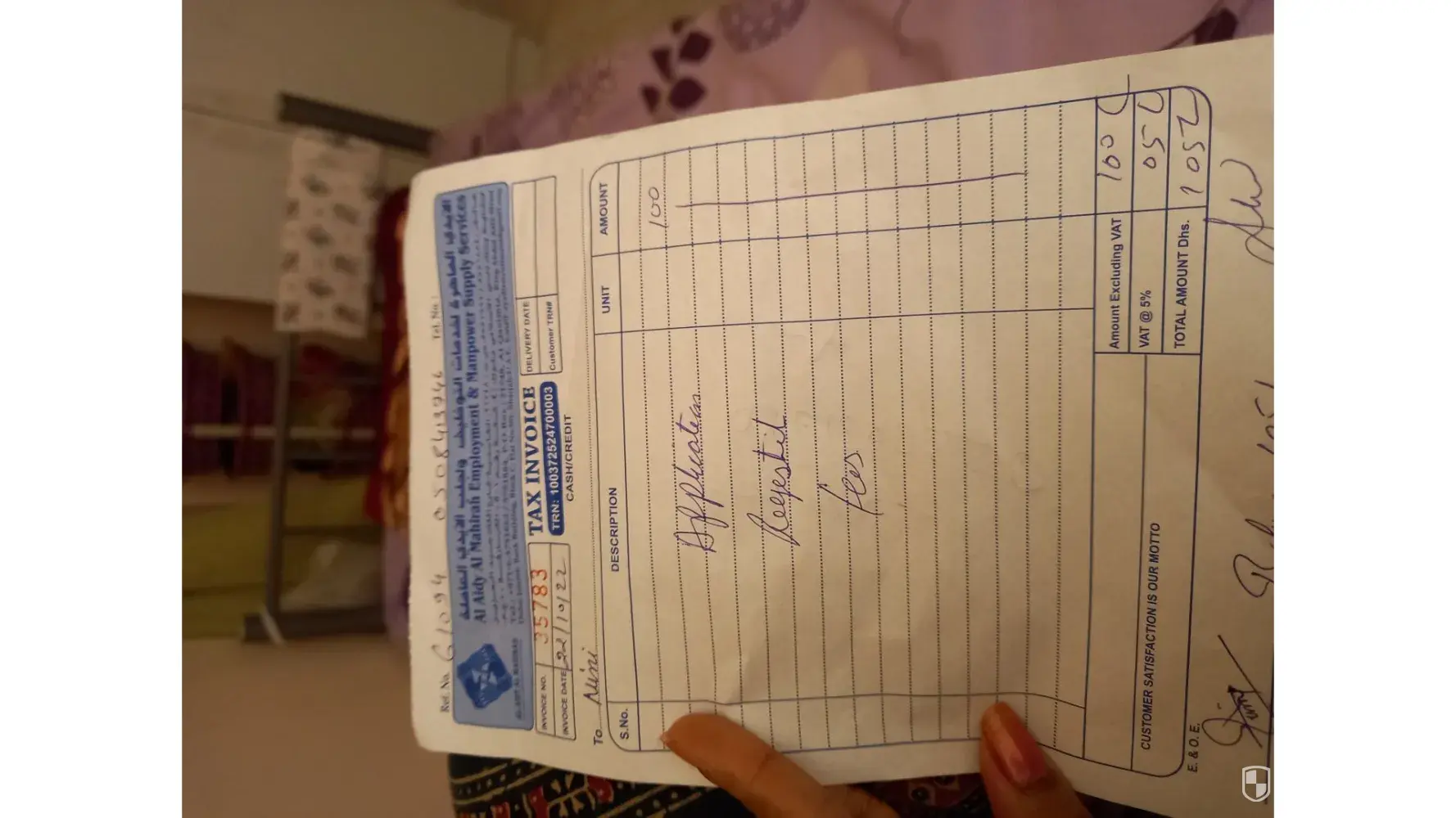 I also gave them 210 dirham tomorrow i will go and get back my money i have also a receipt same like you i dont know what she will response