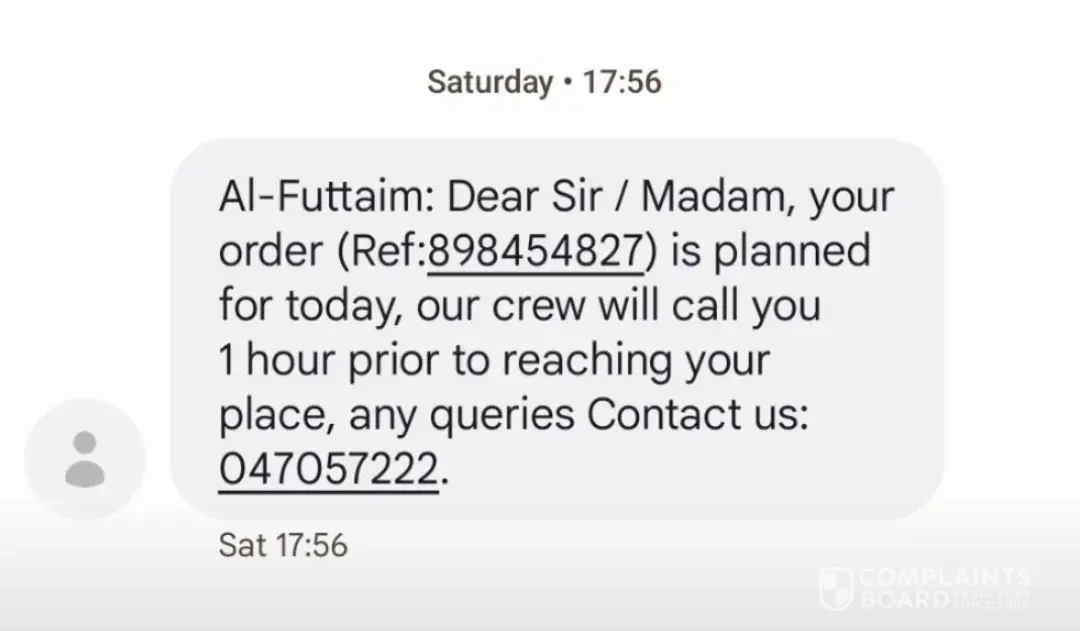 Al-Futtaim: Dear Sir / Madam, your order (Ref:[protected]) is planned for today, our crew will call you 1 hour prior to reaching your place, any queries Contact us: [protected].